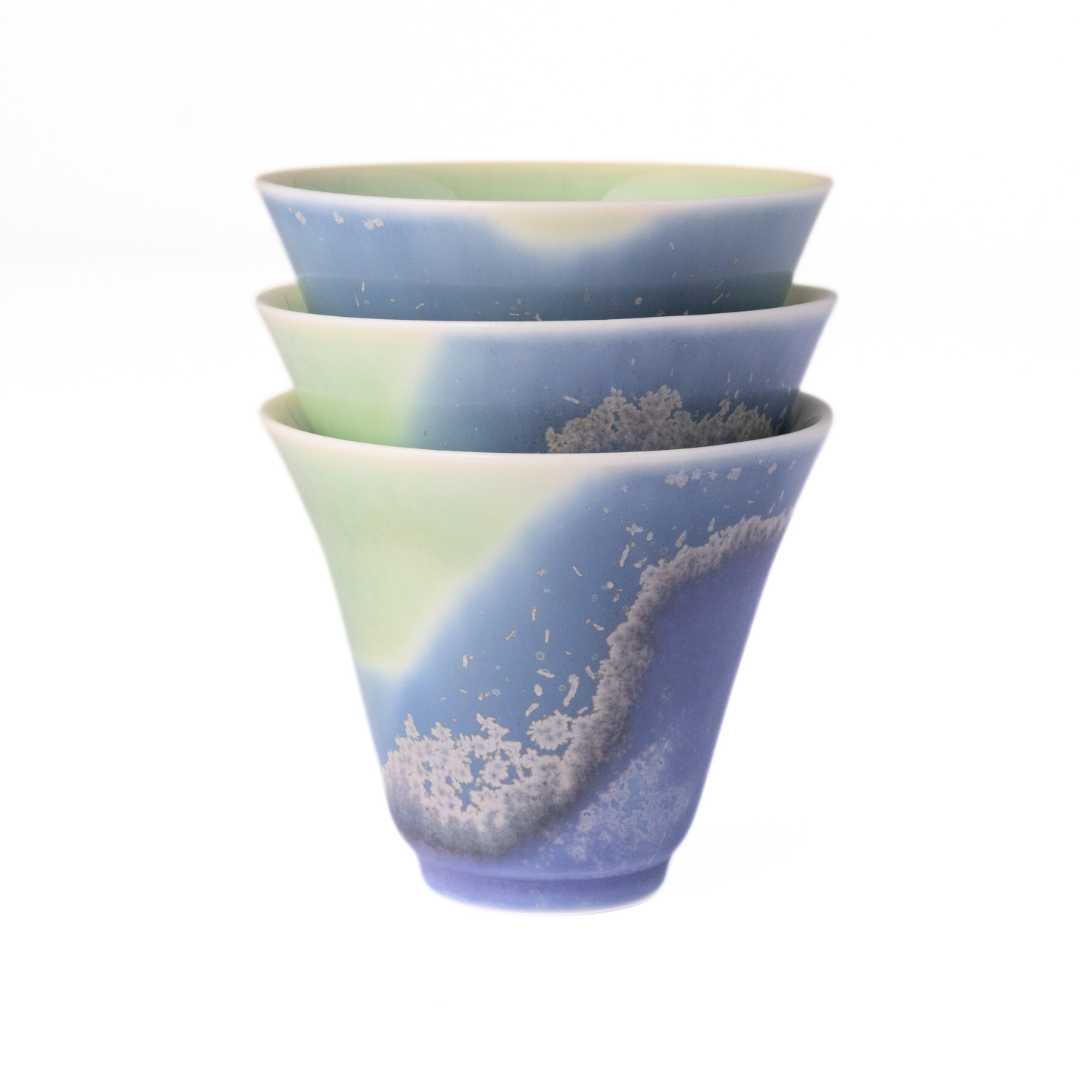 From the minty green and dark splotches reminding us of jadeite to the bright blue with fractals that look like a frozen ocean, the glaze on these put them over the top.