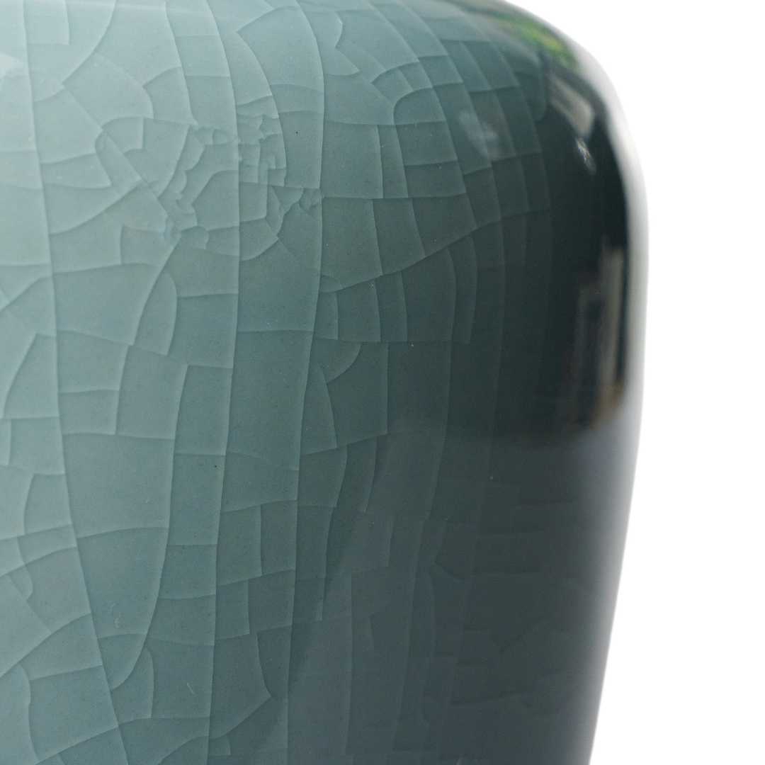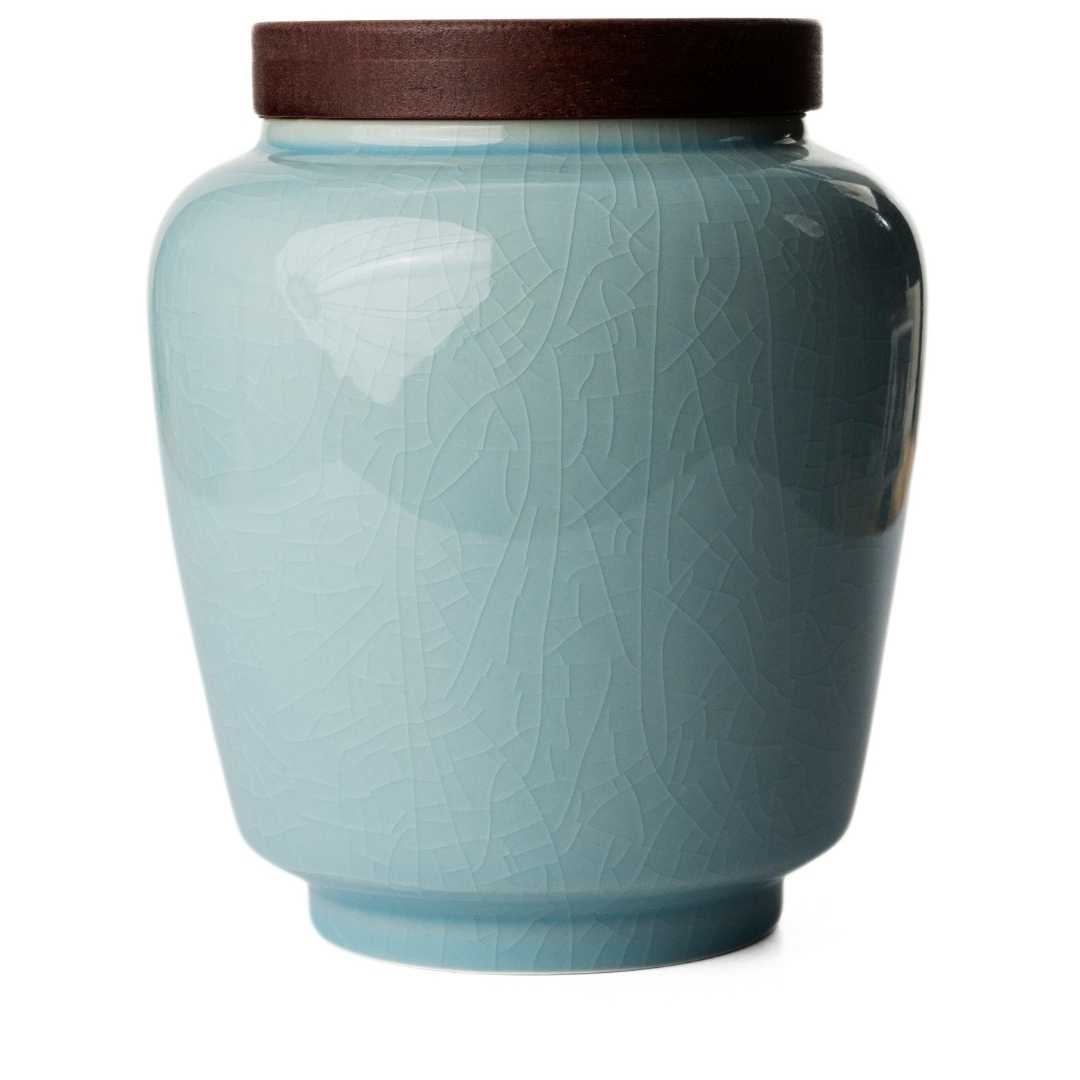 These simple jars are unadorned, glazed in the classing Guan Yao style which causes the glaze to crack but never break or stain like its cousin Ruyao.